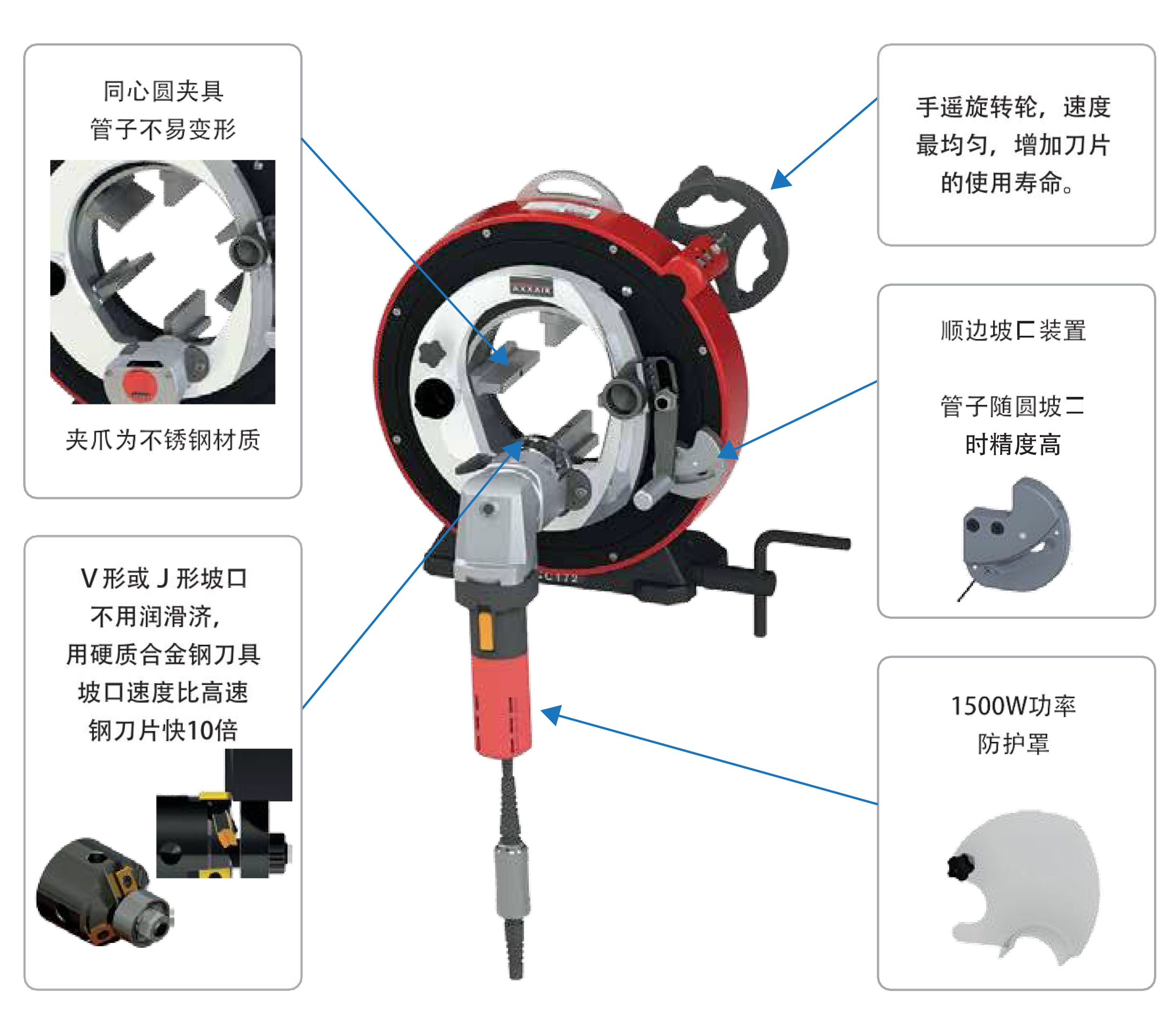 ● 带有硬质合金刀头的锥体刀头装配在GA10坡口电机上、可以更快速、高质量的为管材开坡口(管壁厚度小于<8mm)、这个独特设计理念使开坡口的效率比高速钢相比较提高了近十倍因而也使成本大幅度的降低